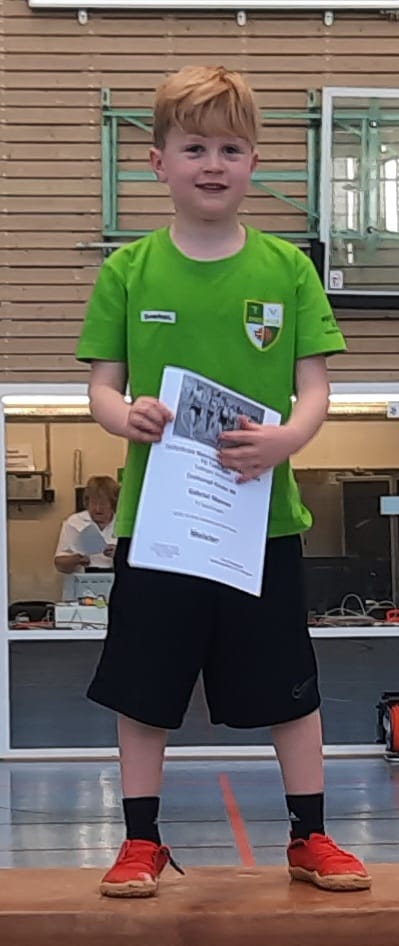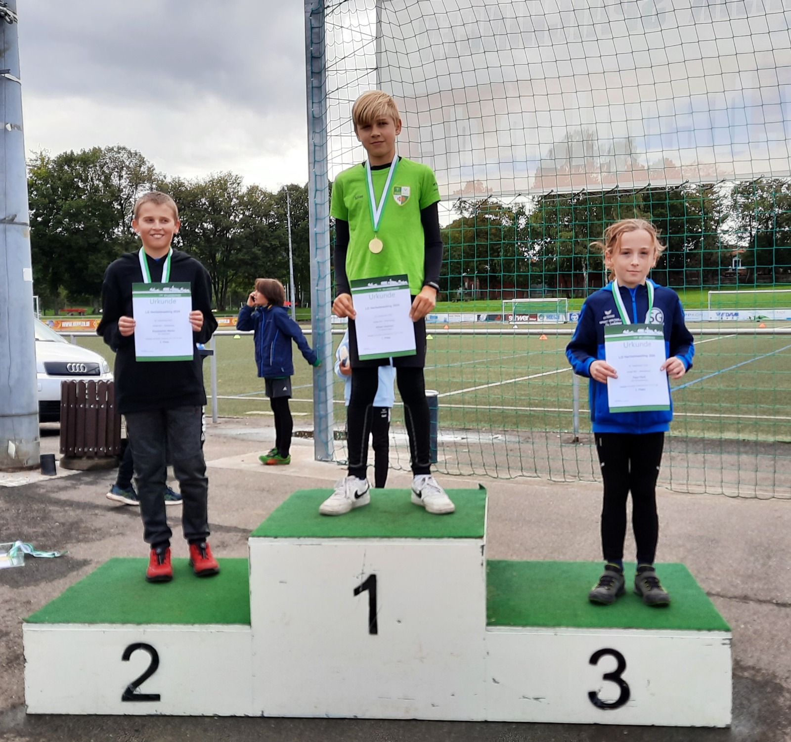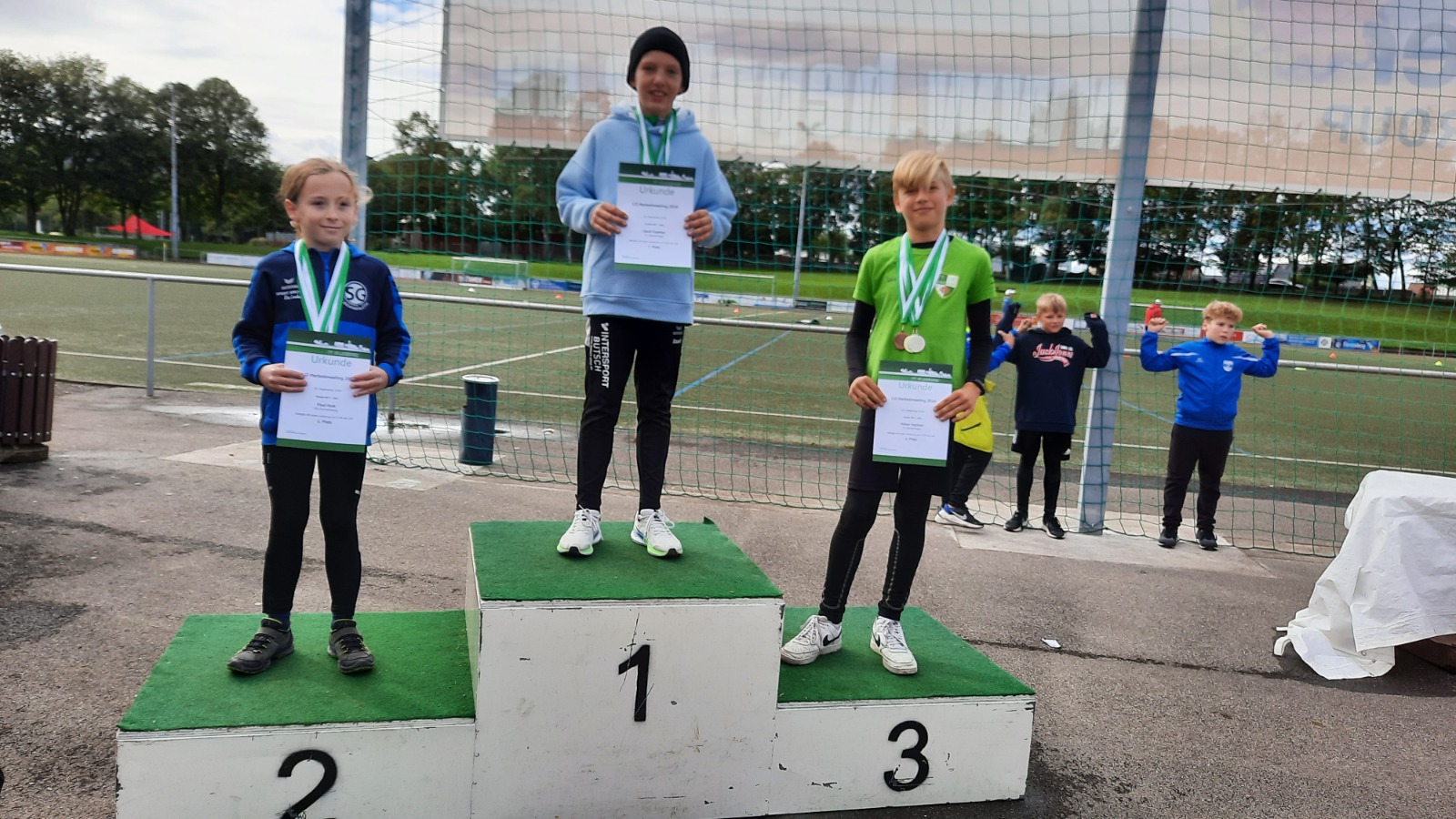 Für Danil Kaehler war dies der beste Wettkampf dieser Leichtathletiksaison. Mit einem 1. Platz über 50m mit starken 8,25 sec. (PB) und im Weitsprung mit 3,58m, zwei dritten Plätzen über 800m in 3:09,27 min (PB) und im Ballwurf mit 26,00 m (PB), war er unser erfolgreichster Athlet. Aber auch sein Vereinskamerad Kilian Vachon konnte sich über eine goldene, silberne und bronzene Medaille in den Einzeldisziplinen freuen. Insbesondere sein Sieg im Hochsprung mit neuer persönlicher Bestleistung von 1,27 m war Klasse. Aber über 50 m und 800 m verbesserte er sich.