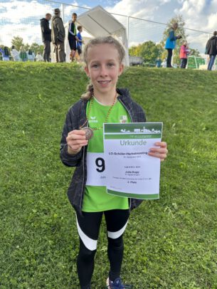 Der Endlauf über 100 Meter Hürden war dann ein Rennen, das für die junge Athletin mit einer neuen persönlichen Bestzeit und erneute Verbesserung ihres eigenen Kreisrekordes endete. Nach 14,22 Sekunden bei 0,8 m Gegenwind freute sie sich mit Trainer Fabian Reisch und ihrem Anhang über den zweiten Platz und die Übergabe der Silbermedaille.Süddeutsche Meisterschaften
